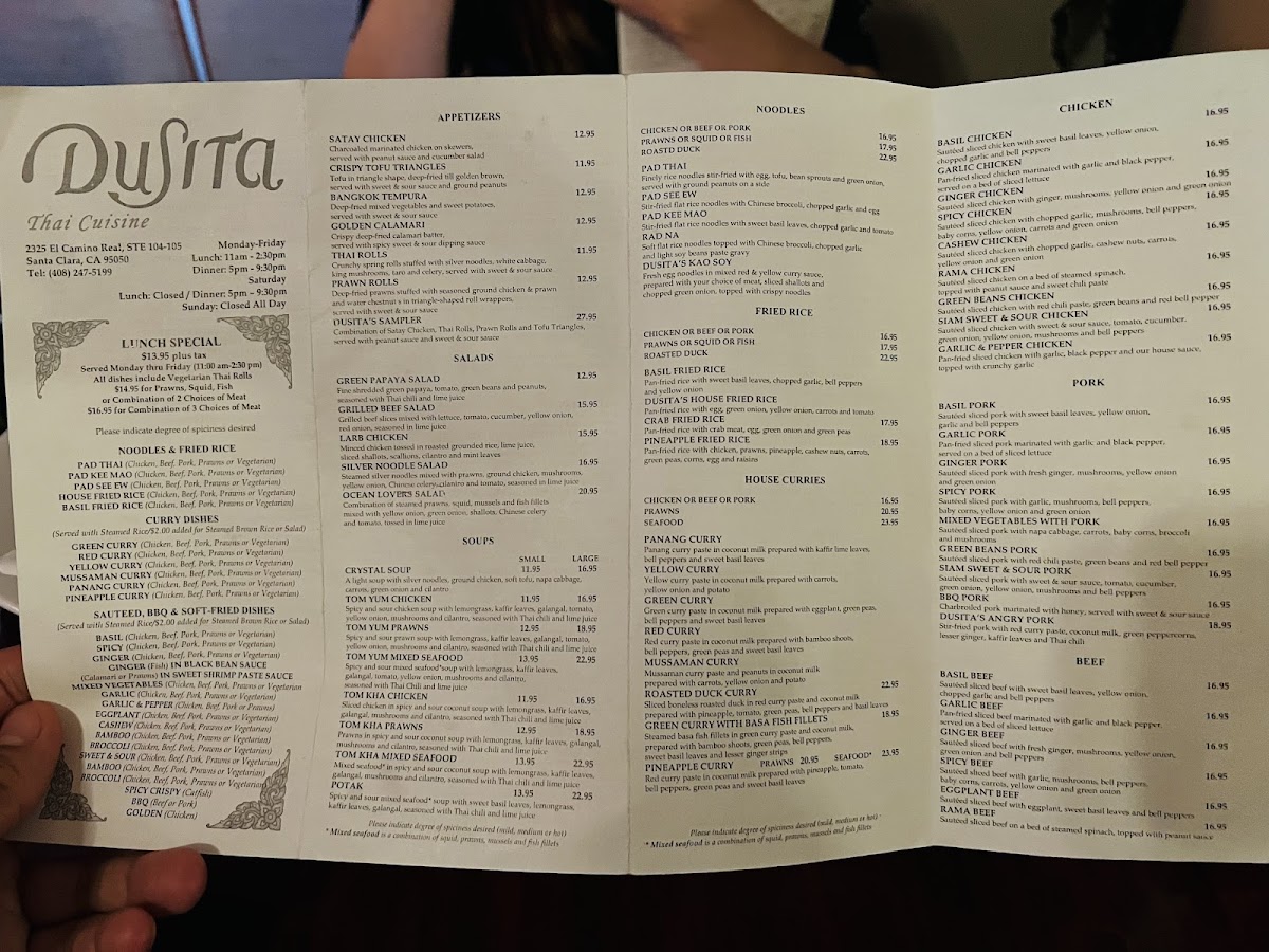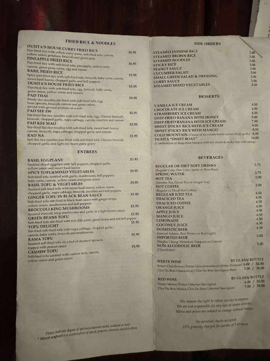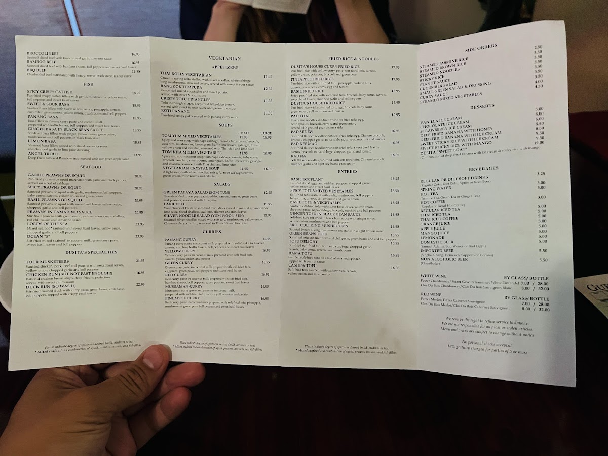 Stir-fried roasted duck with curry paste, green beans, chili paste, bell peppers, topped with crispy basil leaves.