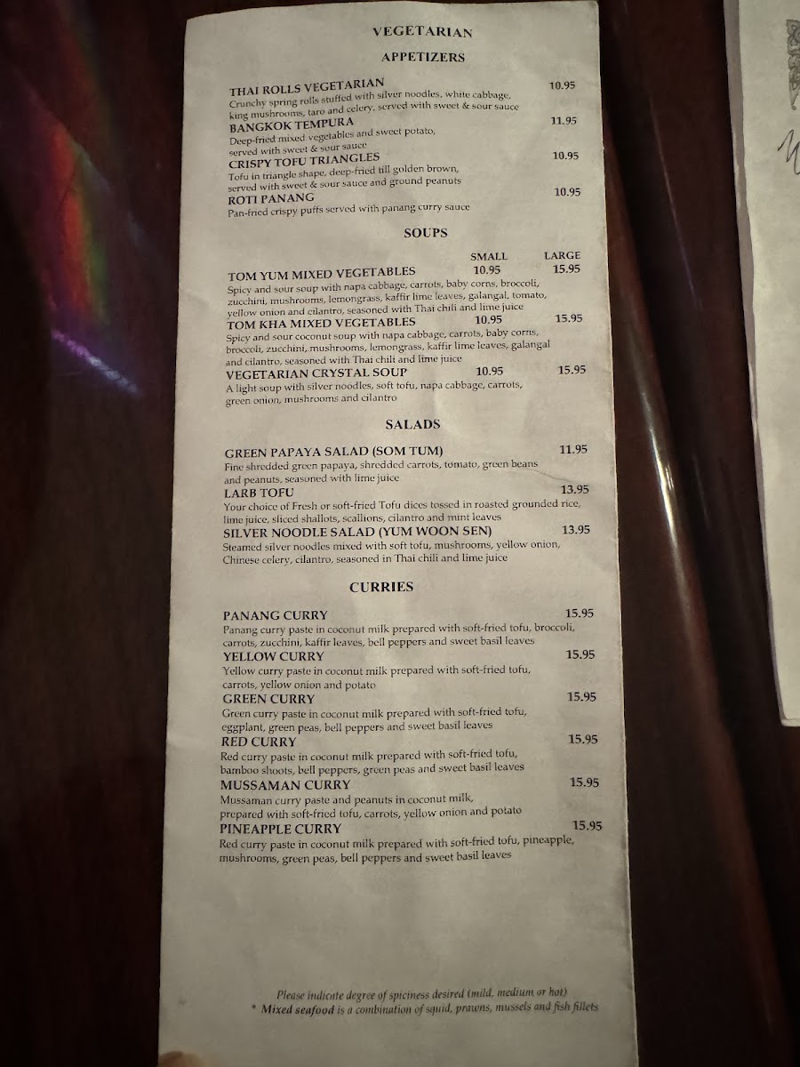 Panang curry paste in coconut milk prepared with soft-fried tofu, broccoli, carrots, zucchini, kaffir leaves, bell peppers and sweet basil leaves.
